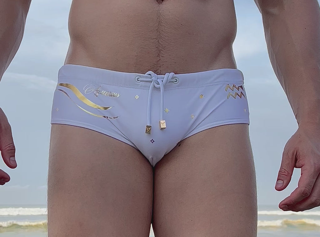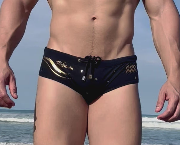 Sofisticado y elegante traje de baño estilo brief con motivo zodiacal del signo Aquarius en dorado