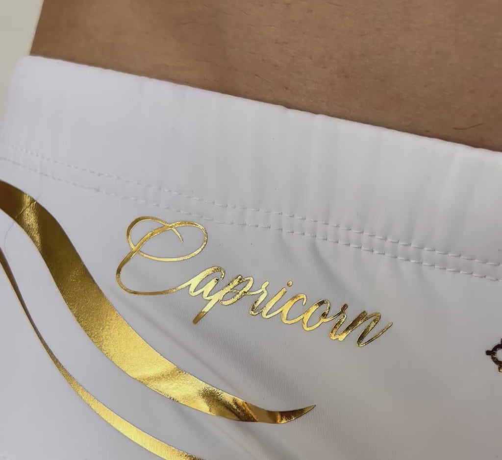 Sofisticado y elegante traje de baño estilo brief con motivo zodiacal del signo Capricornus en dorado