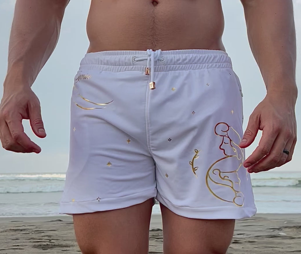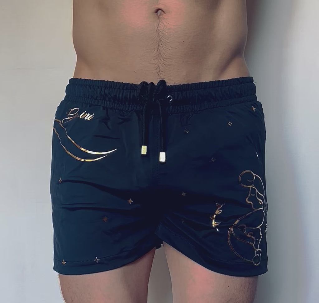 Sofisticado y elegante traje de baño estilo short con motivo zodiacal dorado del signo Gemini
