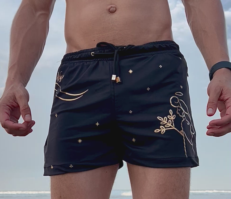 Sofisticado y elegante traje de baño estilo short con motivo zodiacal dorado del signo Virgo